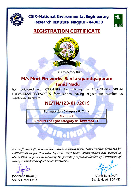 As a responsible member of society and nature, Mori Fireworks is committed to producing only green fireworks, aligning with the verdict of the Hon’ble Supreme Court since 2018.